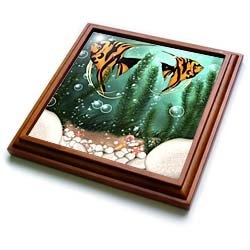 Product DescriptionSize: 8x8 Trivet with 6x6 ceramic tile2 Cute Fish With Bubbles In Aquarium Trivet is measuring 8w x 8h x .75d. Made of solid wood with padding on back that protects your furniture. Framed trivet comes with 6w x 6h ceramic gloss tile attached to the wood frame.