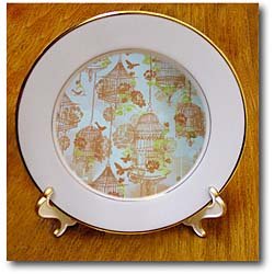 Product DescriptionSize: 8 inch Porcelain PlateCoral and Llime Bird Cages Plate is 7.5" in diameter. Made of white porcelain featuring two 24k gold rims. Excellent to give as a gift commemorating a special person or event. Stand included. Decretive use only.